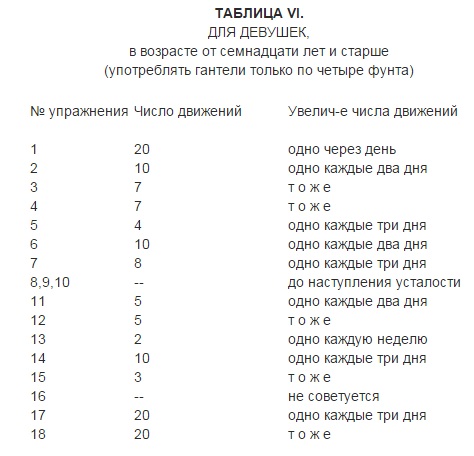 Весь комплекс выполняется без остановок, за 20-30 минут. Вес гантелей 2 кг. Постепенно вес гантелей надо увеличивать до 9 кг