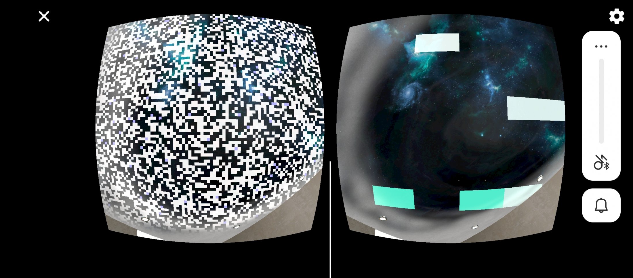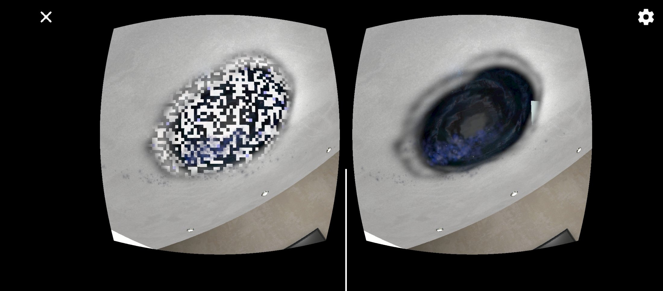 А потом случилось непредвиденное. Как только "окно в Космос" стало достаточно широким, появились странные квадратики-пиксели, которые загородили весь обзор! И ничего толком не стало видно:( Поначалу я решила, что это какой-то единичный сбой. Но последуюшие посещения программы показали, что так происходит каждый раз. И пиксели больше находятся в "левом глазу". Если его зажмурить, то правым глазом Космос все-таки видно. Не знаю как у других пользователей, никто же не пишет свои впечатления от программ, к сожалению. Но у меня эти пиксели висят все время на уровне потолка и исчезают только в конце, тогда, когда " Окно" в Космос начинает сужаться и становится маленьким.