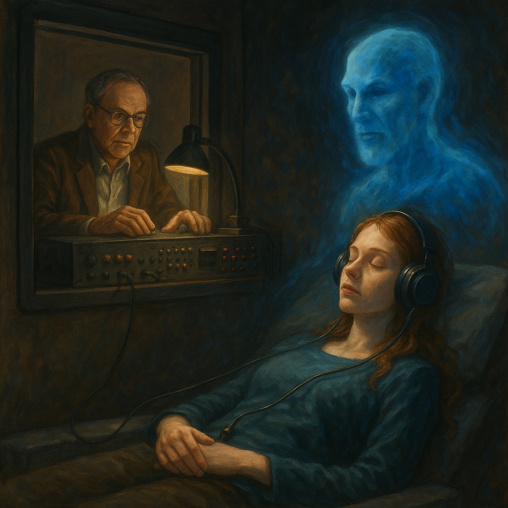 — «Предлагаю чередовать тон более низкий с более высоким в би-науральных ритмах, совершая 4-герцевые «качания» (oscillations) вверх-вниз, чтобы создавать своеобразный «warbling» звук»… обсуждали, какой «волновой» сигнал (синус, квадрат, пилы) лучше, и решили, что важнее не сама частота, а скорость «пробегания» диапазона — 4 Гц, тогда резонанс создаст нужный опыт. Сейчас мы делаем подобное по амплитуде, а тогда — по частоте. Как только у испытуемого зафиксирован стабильно «тета-диапазон», дополнительная модуляция не разрушает основной тета-режим, но открывает в нём новые подуровни и «субсостояния».